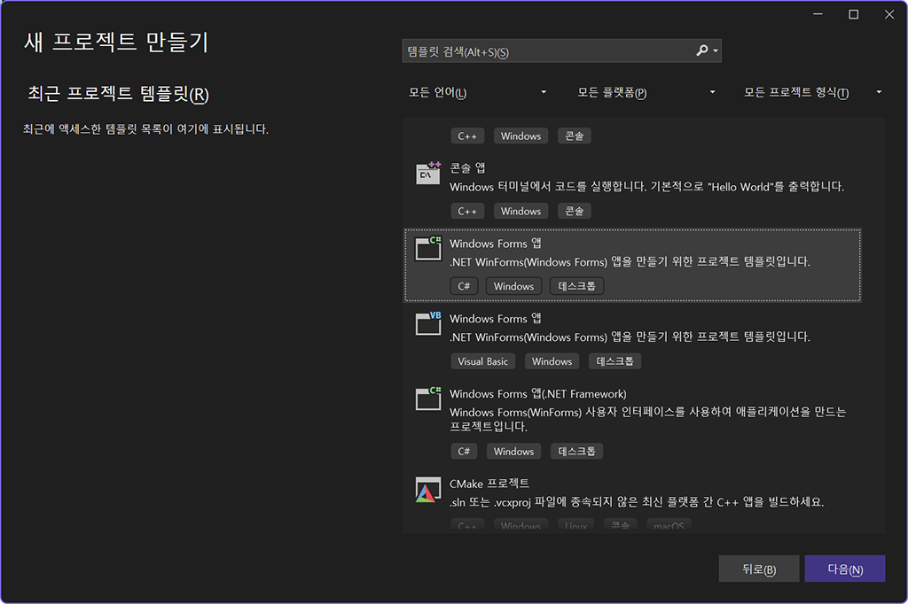 새 프로젝트 만들기를 선택하면 다음과 같은 화면이 나타나는데 Windows Forms 앱을 선택합니다.