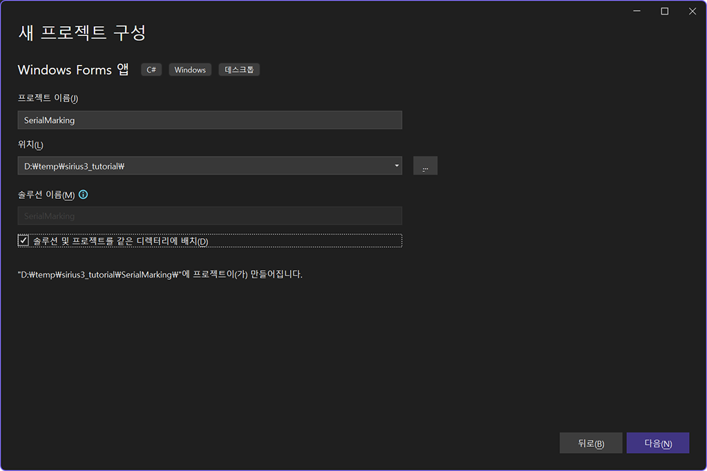 다음 화면이 나타나면 적당한 이름과 위치를 입력하고 다음 버튼을 클릭합니다.