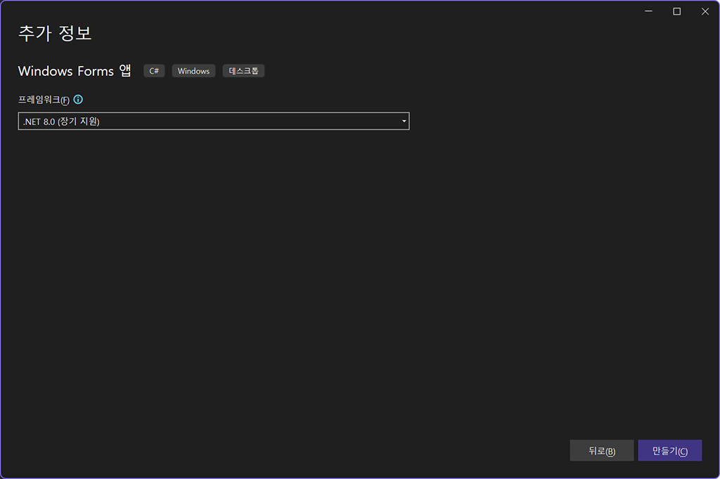 다음 화면이 나타나면 프레임워크 항목을 .NET 8.0 을 선택하고 만들기 버튼을 클릭합니다. 만일 .NET 8.0 이 설치되어 있지 않으면 이곳에서 다운로드 하여 설치하시면 됩니다.