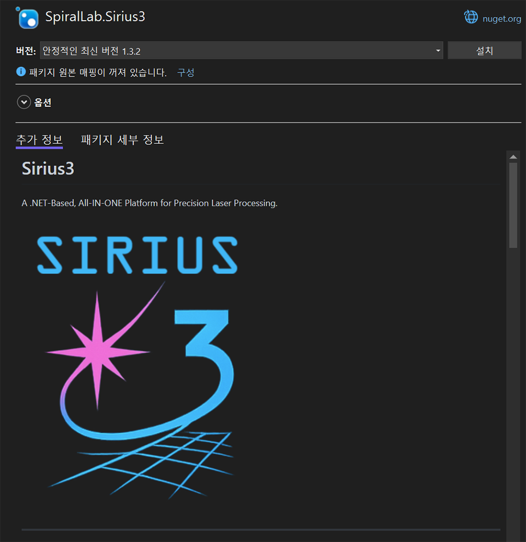프로젝트 > NuGet 패키지 관리 메뉴를 선택합니다. NuGet 패키지 관리자 화면이 나타나면 찾아보기 탭을 클릭합니다. 다음의 패키지를 검색해서 설치합니다 (SpiralLab.Sirius3 로 검색). 버전 번호는 업데이트 상황에 다를 수 있습니다. 최신 버전 사용을 권장합니다. 이 튜토리얼은 1.7.1 버전 기준입니다.