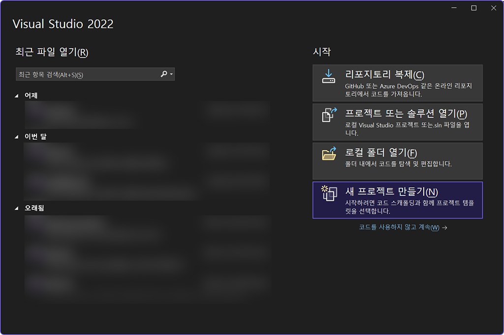Visual Studio 2022 이상 버전을 실행하고 새 프로젝트를 선택합니다.