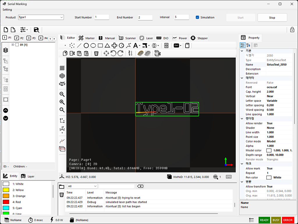 생산되는 제품을 선택하고 시작 번호, 끝 번호, 시간 간격을 입력하고 제품 별 일련번호를 각인하는 시나리오로 Form을 구성하였습니다. 프로그램이 실행되면 하단에 로그 영역이 나타나고 진행되는 정보를 출력해서 현재 상황을 파악할 수 있도록 했습니다.